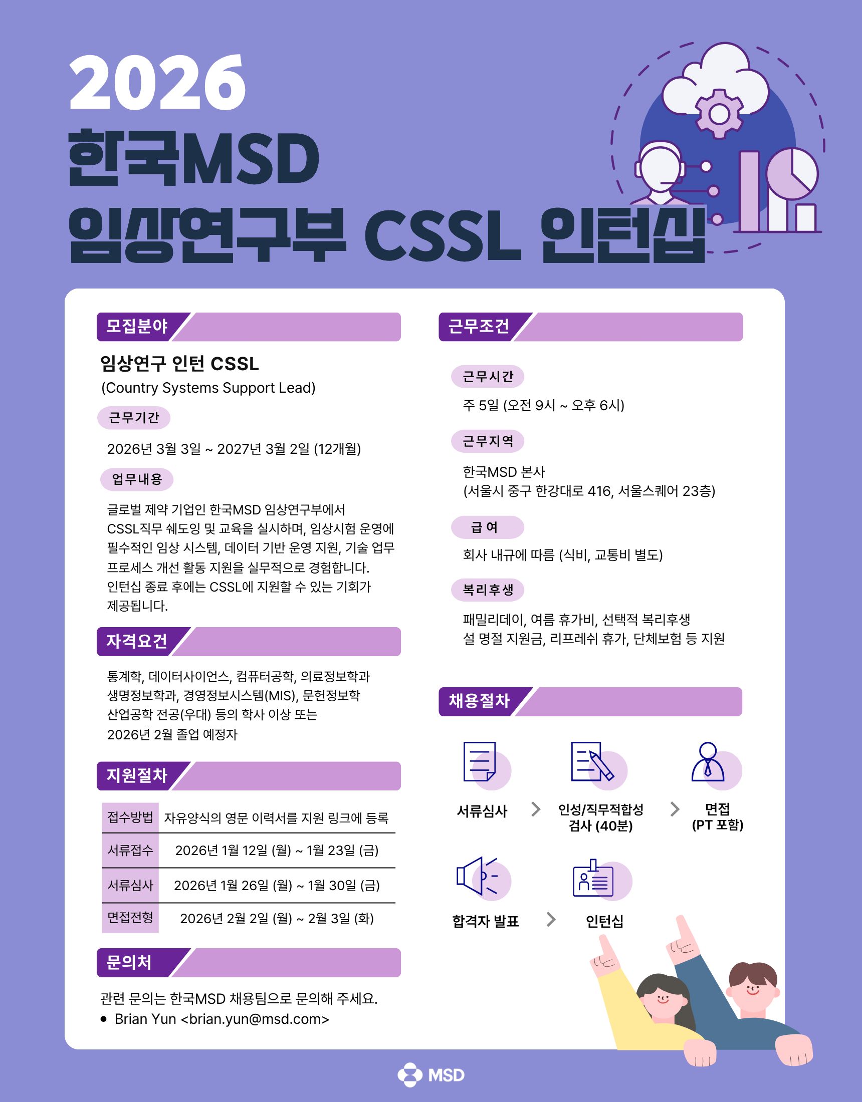 2026 한국 MSD 임상연구부 CSS 인턴 모집 안내합니다.