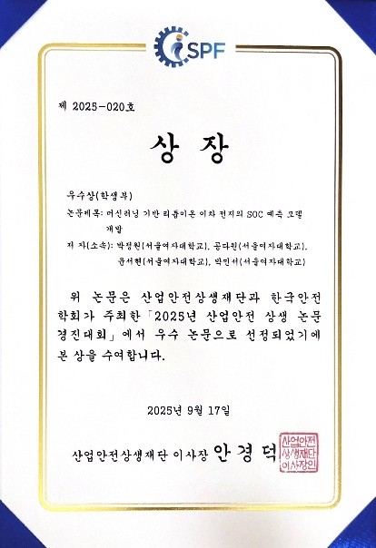 데이터사이언스학과 박민서 교수와 윤서현,공다원,박정원 학생(3학년)이 2025년 9월 17일에 현대건설 본사에서 진행된 산업안전상생재단 주최, 현대 그룹 후원, 2025 산업안전 상생 논문 경진대회'에서 우수상을 수상했다.